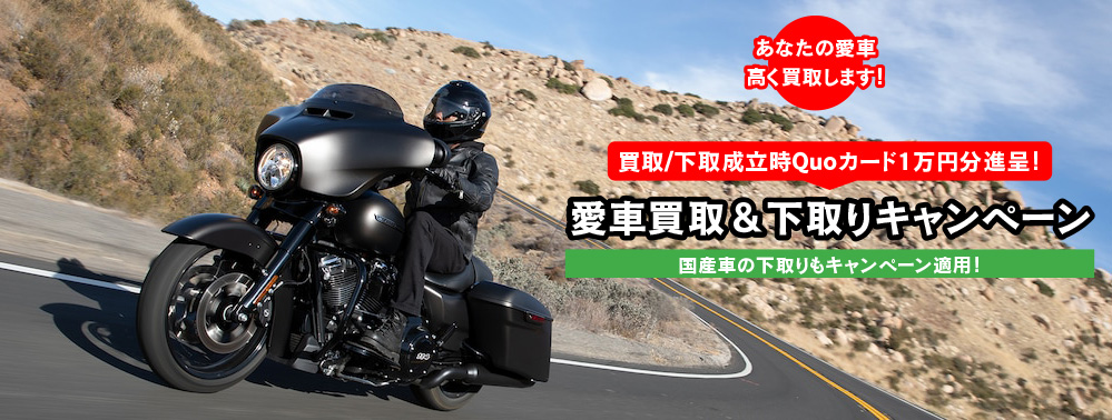 | 特典 | お客様の車両を特別査定 (特にハーレーダビッドソン 国産車両 その他) 成約 入庫時に QUOカード1万円プレゼント (50万以下は 5000円になります) |